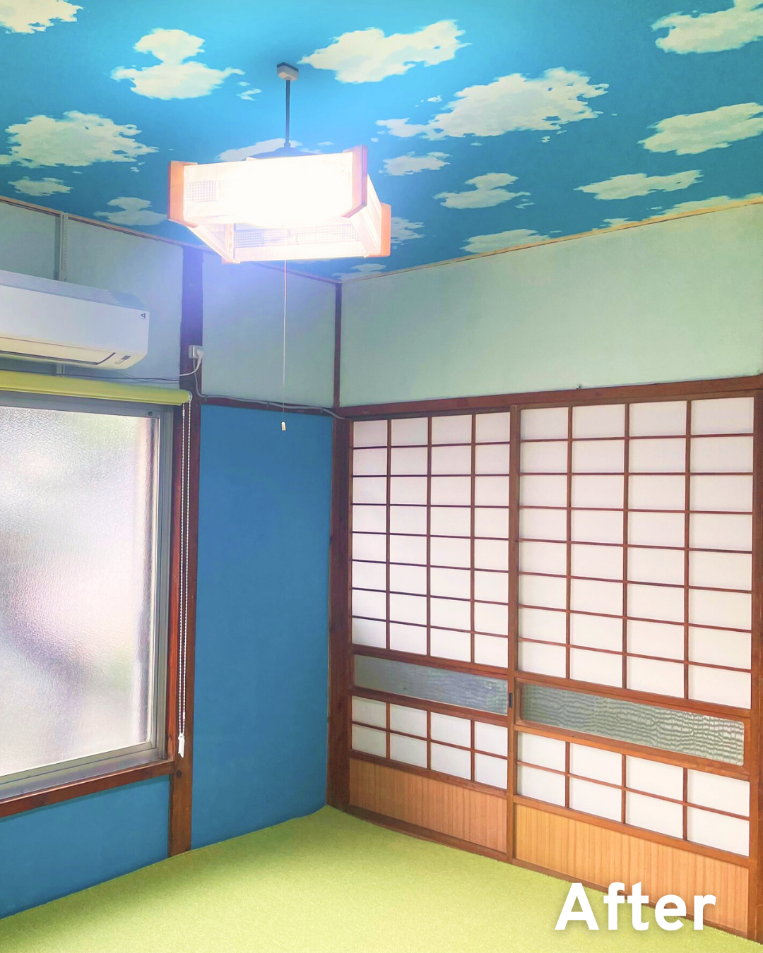 高校生・大学生・社会人のボランティアさんたちが、一人ひとりに寄り添いながら子供たちの勉強をサポートする支援スペース「てらこや なないろ」。子どもたちが毎日過ごす大切な空間を、より明るく、より楽しく過ごしやすくするために、天井には真っ青な空と白い雲がデザインされた壁紙を、床にはさわやかなグリーンのカーペットを選定しました。