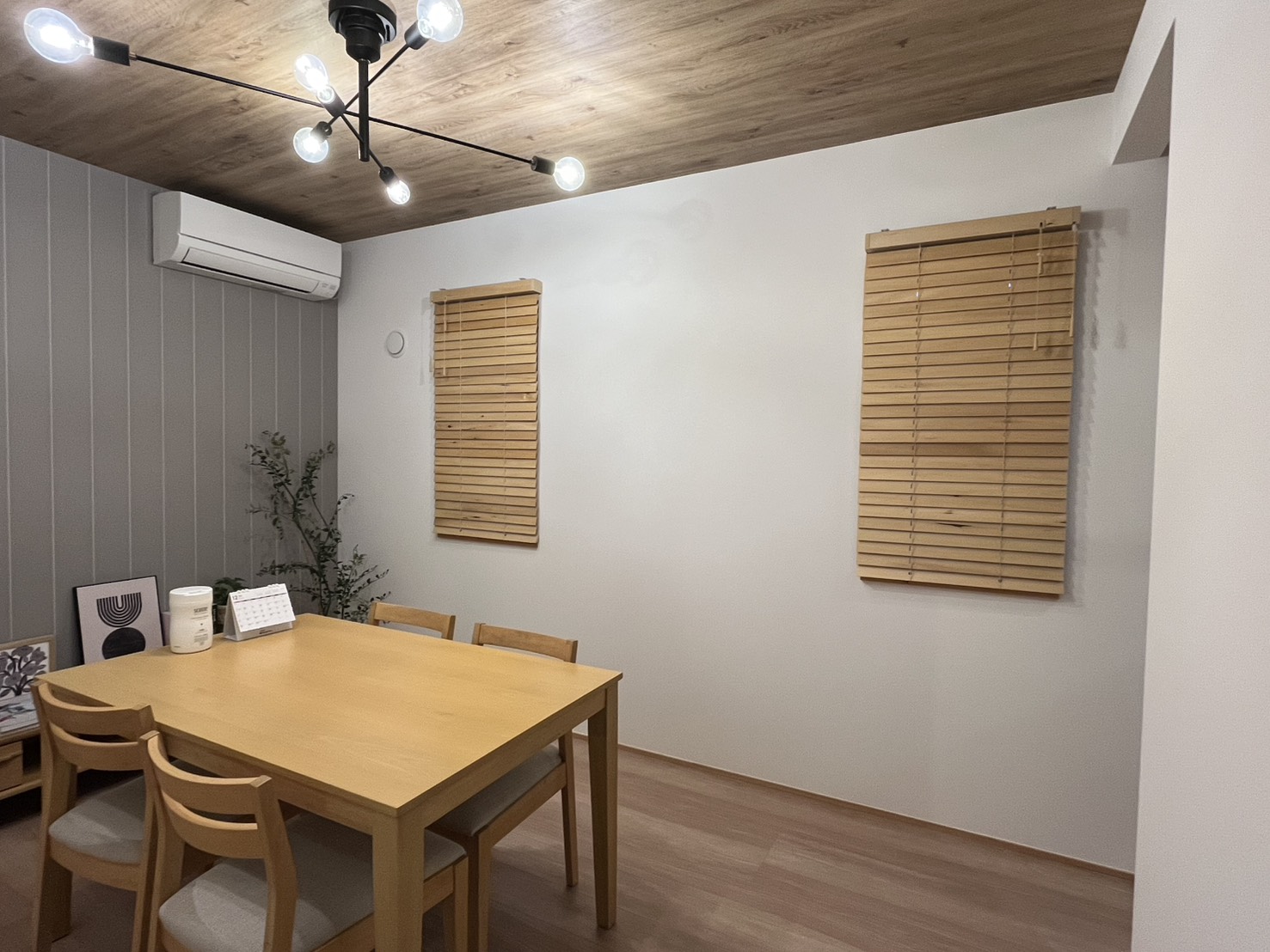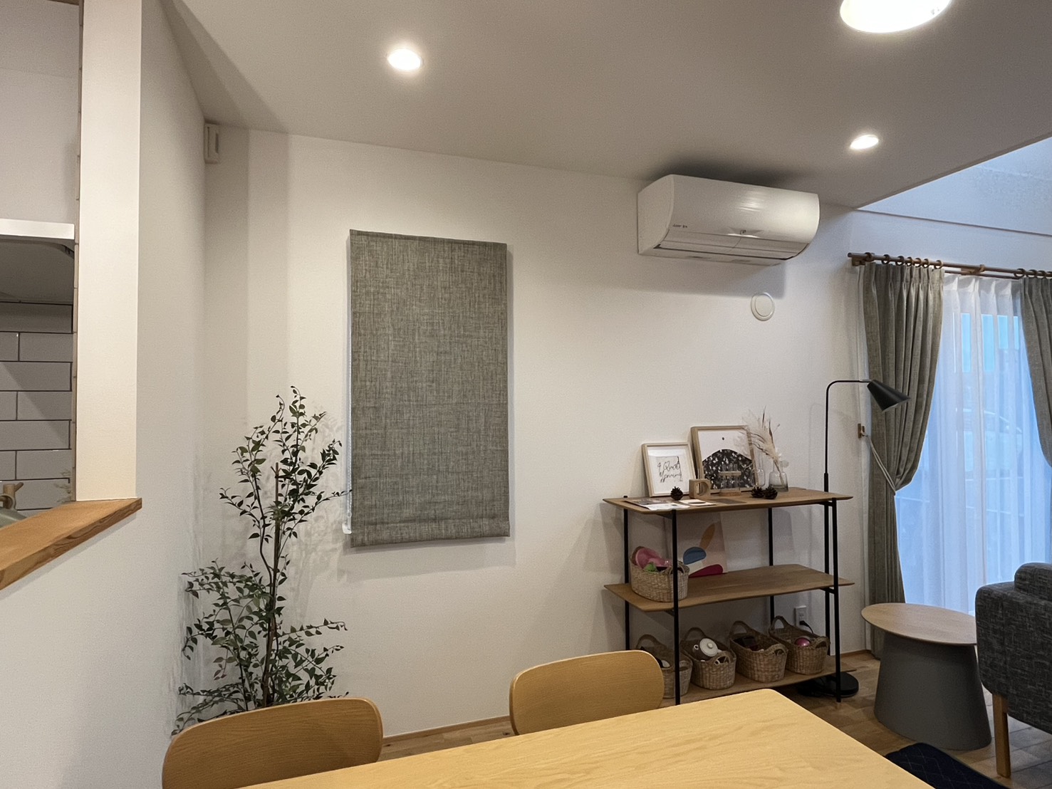 ダイニングの腰窓に掛かるプレーンシェードの厚手生地も、リビングで採用させていただいた厚手のカーテン生地で合わせ、緩やかにつながる空間に統一感を出しています。