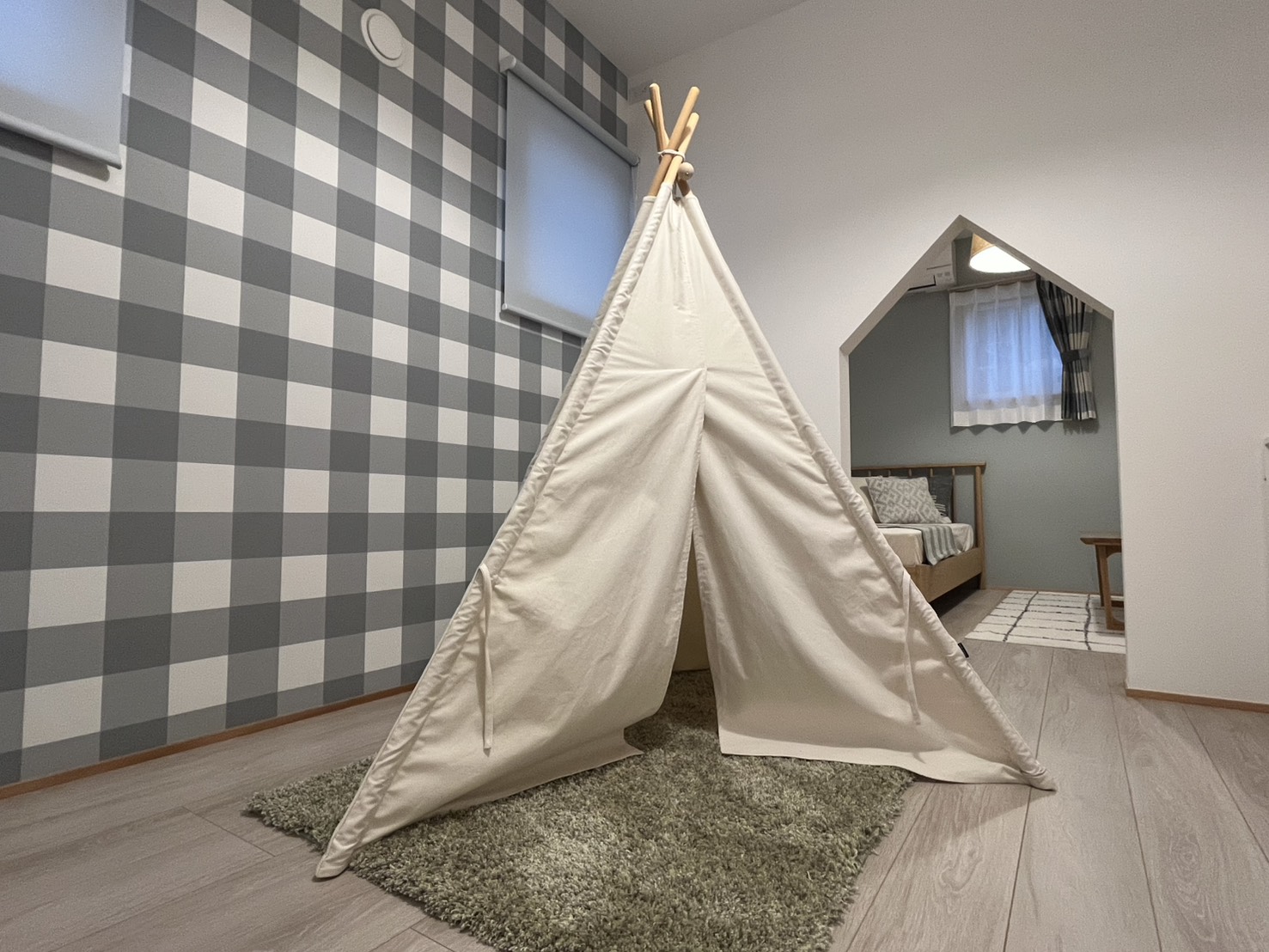 続いて、2階にあるベッドルーム2部屋です。真ん中の間仕切りには家形の開口があり、子どもたちがくぐり抜けて遊べるようなお部屋となっていました。この2つの空間にバランスを持たせ、遊び心のあるイメージを損なわないようなコーディネートさせていただきました。