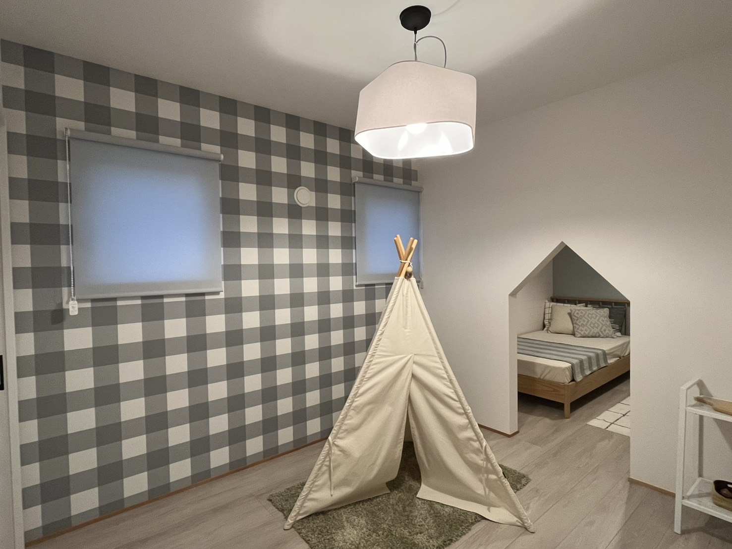 そのため、反対側のお部屋はサンゲツのチェック柄カーテン「OP3087」。こちらもアクセントクロスのチェック柄を取って、空間に統一感を持たせています。