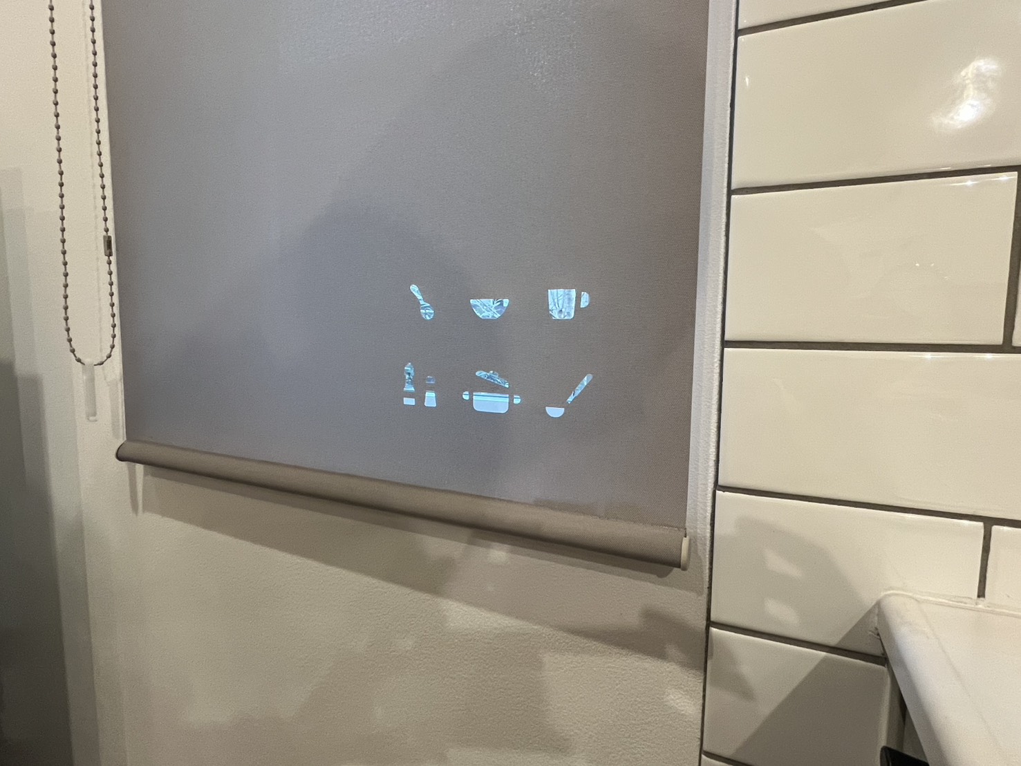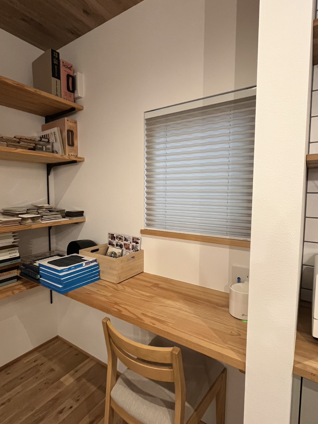 ワークカウンタースペースの小窓には、サンゲツのプリーツスクリーンPS138を選定しました。グレージュ色の生地を通して、空間に柔らかな光を取り込みます。