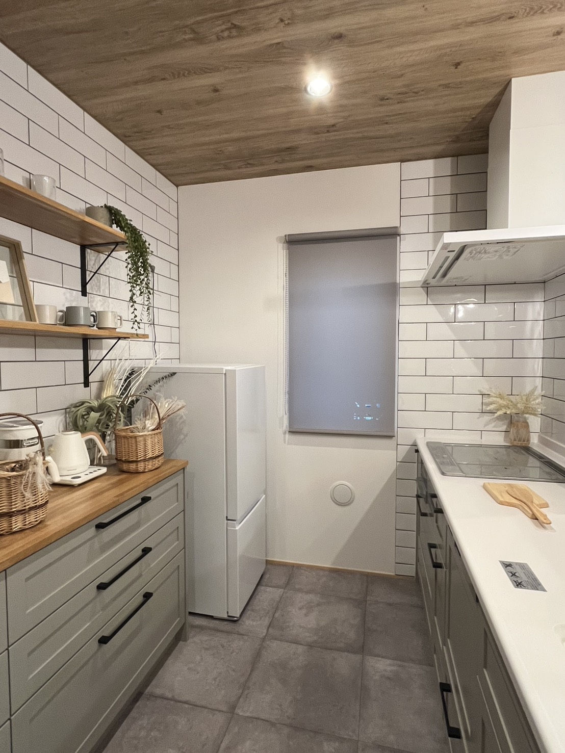 キッチンは、トーソーのロールスクリーン「TR6034」。柔らかなグレー色でイメージを合わせ、オプションのレザーカット「TIPE303」でキッチン空間ならではの遊び心を加えました。