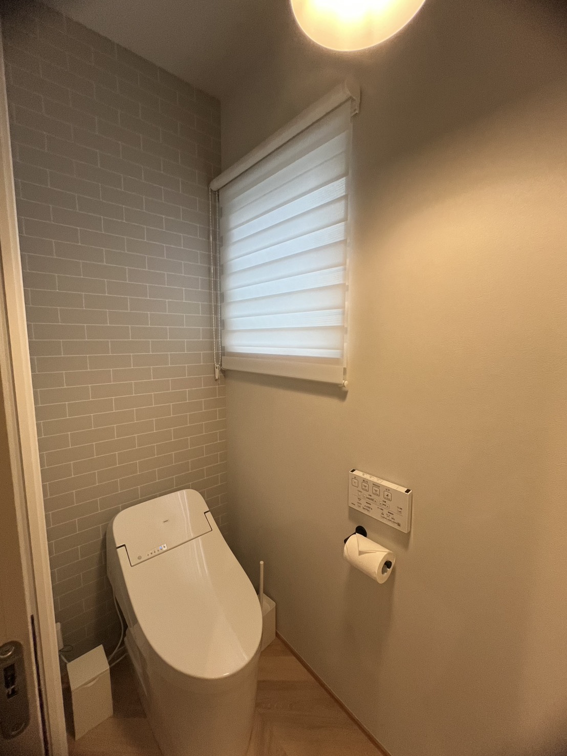 トイレは、サンゲツの調光ロールスクリーン「CP101」。採光をしながらプライバシーも守ることができる機能に優れています。見た目もスッキリとしているため、狭い空間の小窓でも軽やかに設置できます。