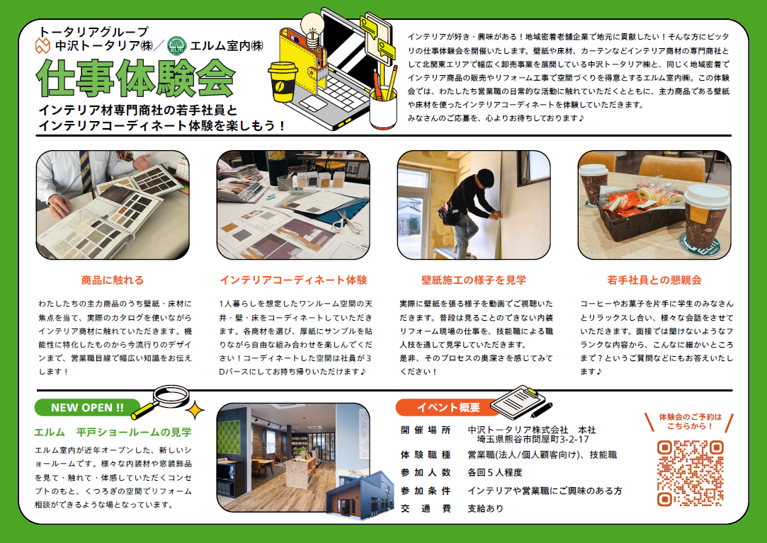 この度、グループ会社の中沢トータリア株式会社と一緒に、2026年3月卒業予定、ならびに2027年3月卒業予定の学生様を対象とした仕事体験会を行います!