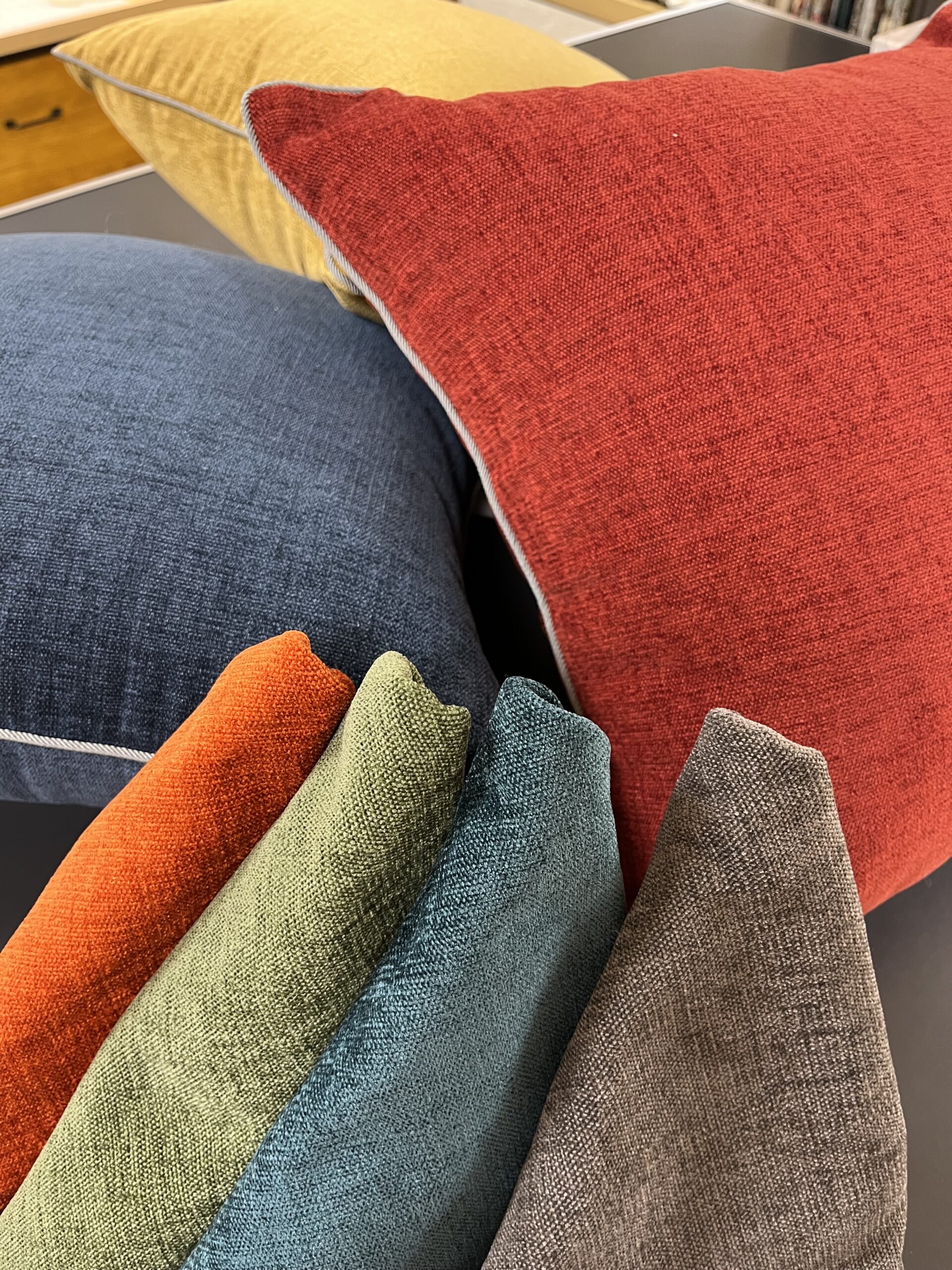 当店でお取り扱い中のカラーは、ブルー、ブルーグリーン、グリーン、グレー、オレンジ、レッド、イエローの全7色。展開色が多いことから様々なファブリックやカーテンにも対応できるため、コーディネートすることで空間全体の魅力が引き立ちます。